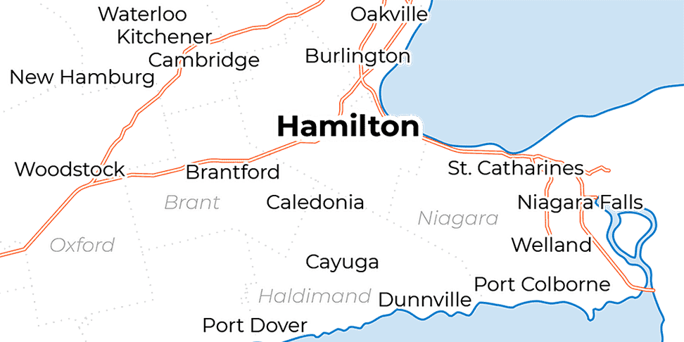 Hamilton, Oakville, Burlington, Brantford, St. Catharines, Niagara, Waterloo, etc.
